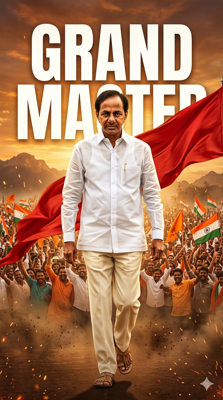 Powerful cinematic political poster of a confident Indian leader walking forward, wearing a white shirt and cream pants with sandals, strong heroic expression, massive crowd in the background cheering with flags, dramatic sunset sky with orange and golden tones, mountains and rally atmosphere, red flag flowing across the scene, dust and sparks in the air, ultra detailed, epic leadership vibe, cinematic lighting, depth of field, poster design, bold large typography behind saying “GRAND MASTER”, high contrast, dramatic color grading, 9:16 vertical composition, ultra realistic, 8k, sharp focus.