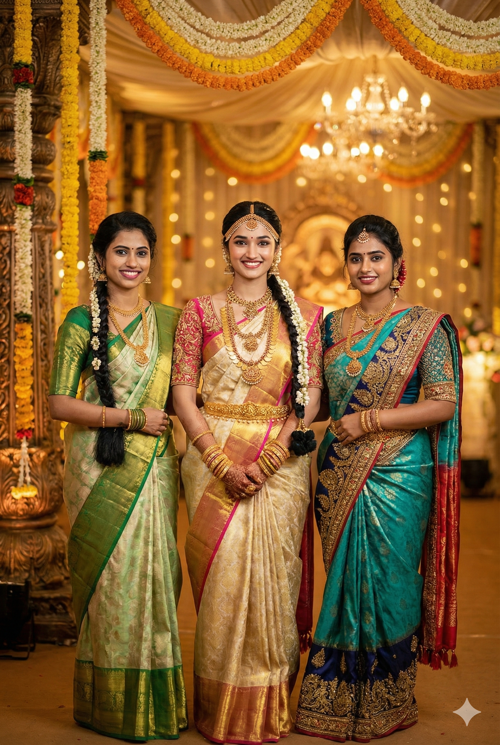 On both sides, two bridesmaids pose confidently, wearing rich silk sarees—one in green and cream with a long braided hairstyle, and the other in teal and navy blue with heavy embroidery and red borders. Both wear traditional gold jewelry and festive makeup.