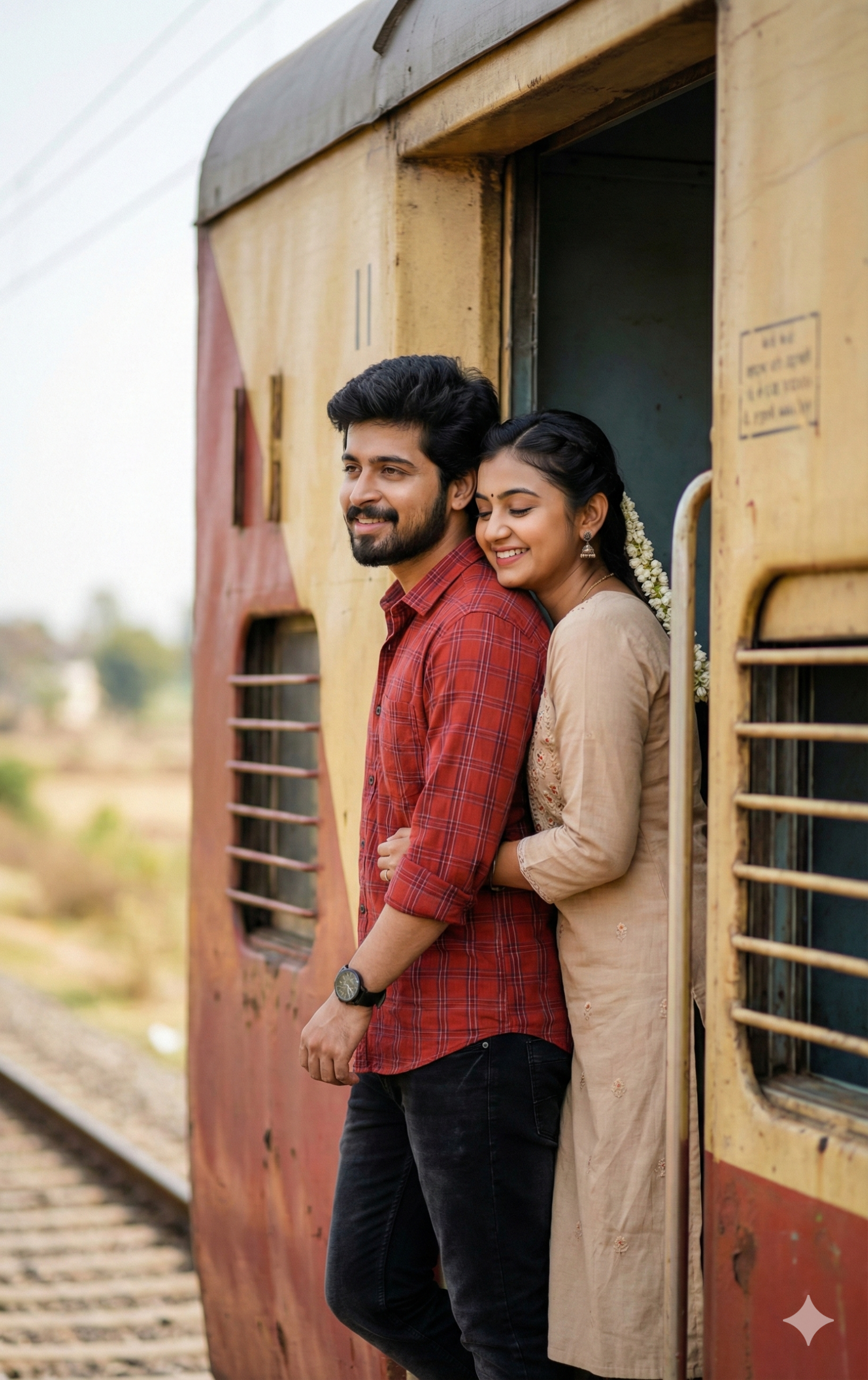 A candid cinematic portrait of a young Indian couple standing at the open doorway of an old Indian train. The man is wearing a red checkered shirt with a well-groomed beard, smiling softly and looking outside. The woman is wearing a beige traditional kurti with a small black bindi, leaning gently on his chest, smiling with warmth and affection. Natural skin tones, expressive eyes, emotional connection, romantic mood. Vintage train interior with yellow and red metal panels, shallow depth of field. Soft natural daylight entering from the side, cinematic color grading, realistic textures, ultra-detailed, DSLR photography, 85mm lens, f/1.8, high resolution, professional photography, candid love moment.9:16 ratio