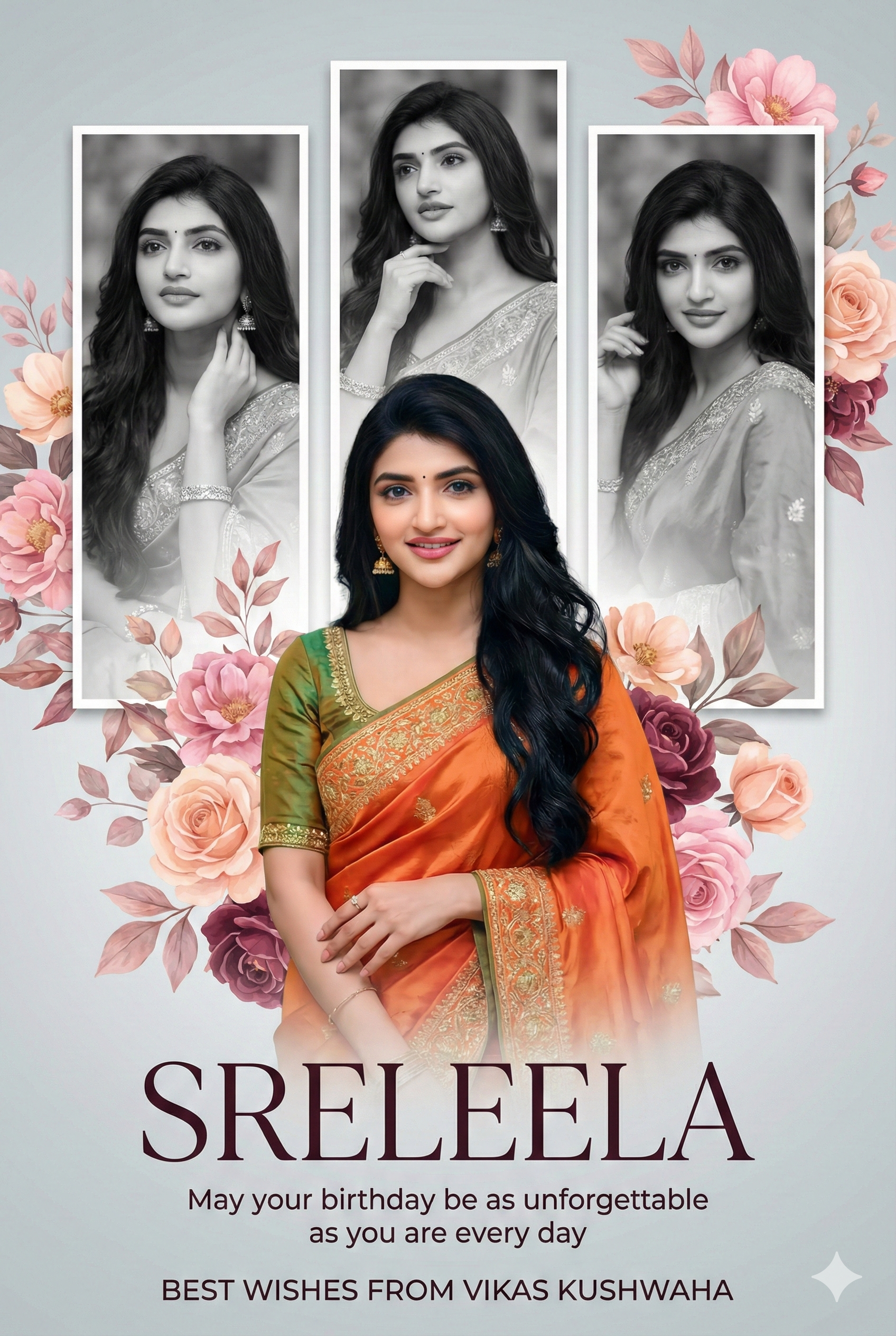 A stylish birthday poster design featuring a beautiful young Indian woman in a traditional saree. The main subject is placed at the bottom center in full color, wearing an elegant orange saree with a green blouse, subtle makeup, small bindi, long black hair softly waved and resting over one shoulder, gentle smile, graceful hand pose. Behind her, three vertical portrait frames appear in a row, each showing the same woman in different elegant poses, converted to black-and-white with soft for a dreamy effect.