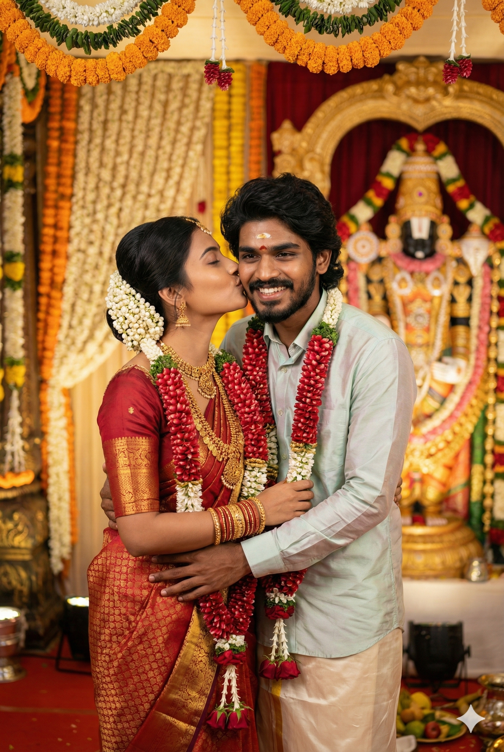 A beautiful South Indian wedding couple posing romantically during a traditional temple-style wedding ceremony. Bride wearing a rich red silk saree with heavy gold jewelry, layered gold necklaces, bangles, traditional bridal makeup, jasmine flower hair bun, kumkum and bindi. Groom wearing a light pastel silk shirt and traditional attire, subtle beard, tilak on forehead. Both wearing fresh red and white flower garlands. Romantic candid moments – bride kissing groom’s cheek, couple smiling and embracing lovingly. Vibrant temple backdrop with Lord Venkateswara idol, marigold flower decorations, festive wedding mandap background. Warm cinematic lighting, shallow depth of field, ultra-realistic photography, sharp focus, rich colors, soft glow, professional wedding photoshoot, 4K resolution, portrait orientation, emotional and joyful mood. Note : don’t change the upload photo faces
