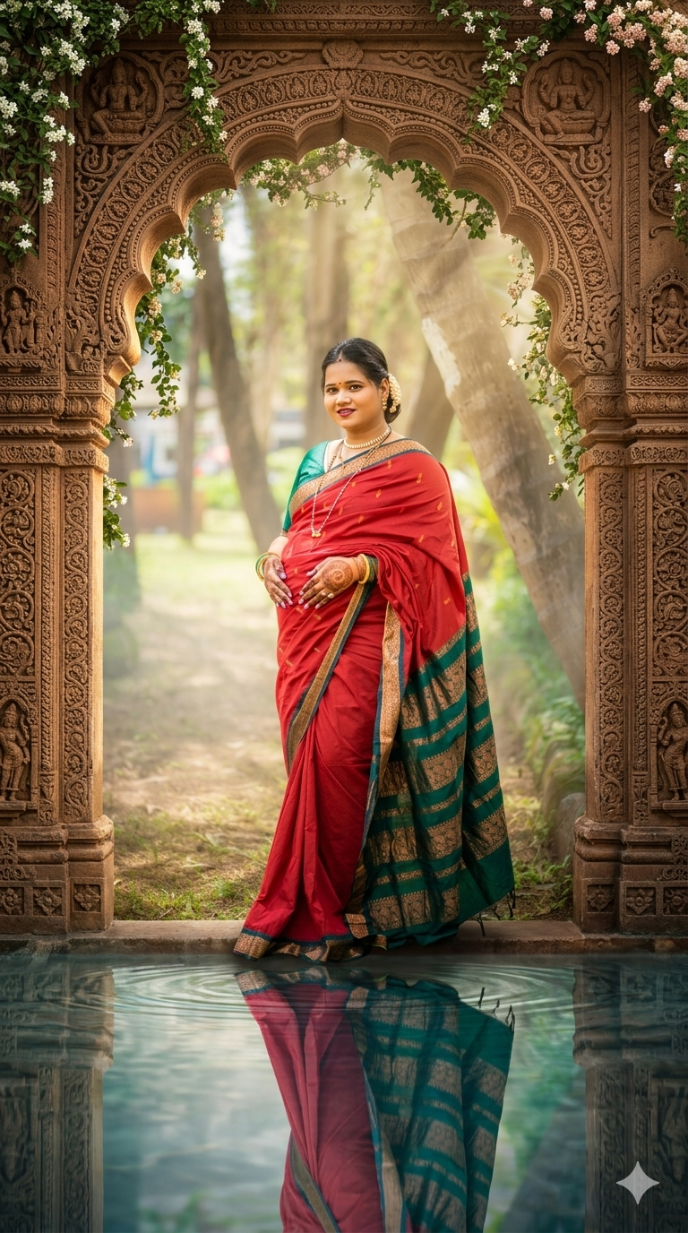 Scene: Add a grand antique Indian temple-style carved stone arch around the subject, decorated with natural green vines and leaves.