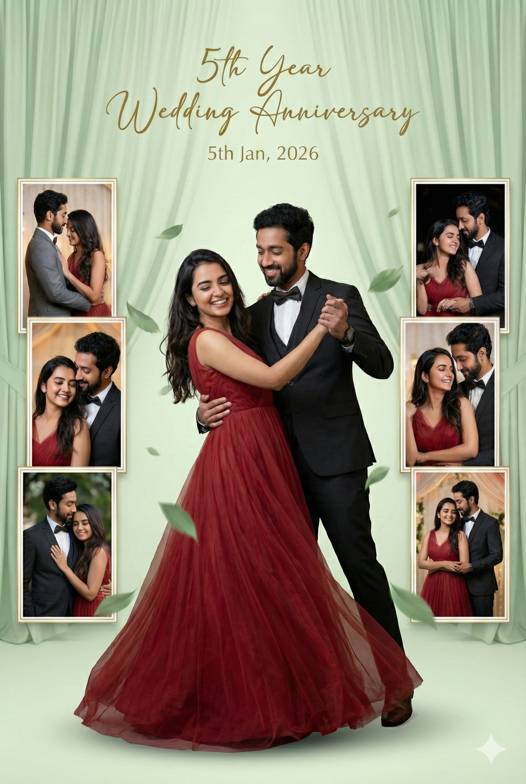 A luxury 5th wedding anniversary poster featuring a happy married couple in an elegant studio setup. The wife is wearing a flowing olive-green tulle gown with soft layers and sheer texture, smiling joyfully. The husband is wearing a tailored grey suit with a white shirt and red bow tie, standing beside her in a candid, loving pose.