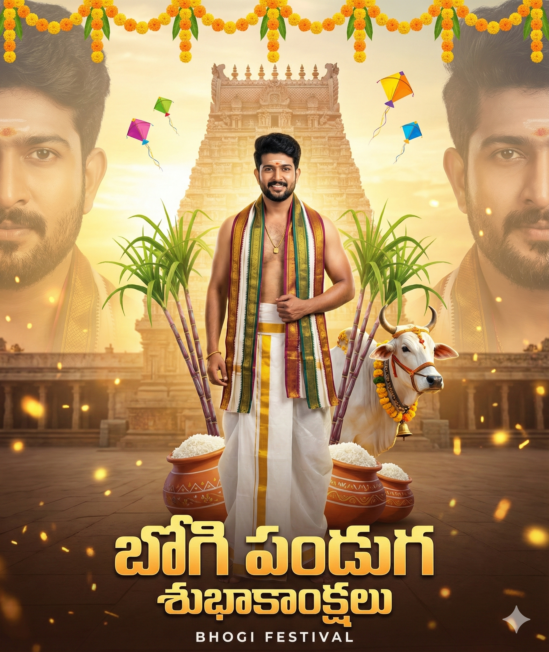 A handsome South Indian man standing confidently in the center wearing traditional white dhoti with golden border and colorful angavastram, smiling face, sacred vibhuti and kumkum on forehead, muscular yet elegant look.Background shows a grand South Indian temple gopuram glowing in golden sunrise light.On both sides soft faded large portrait faces of the same man creating a cinematic symmetrical composition.Traditional Bhogi festival elements: sugarcane sticks tied behind him, decorated clay pots filled with rice, a beautifully adorned white cow with garlands and bell, colorful kites flying in the sky, marigold flower toran hanging on top.Warm golden particles floating in the air, festive atmosphere, spiritual and cultural vibe.Ultra-realistic, cinematic lighting, depth of field, high contrast, rich colors, festival poster style, 4K quality, sharp focus, professional photo manipulation look.Text Prompt (Bottom – Telugu):బోగి పండుగ శుభాకాంక్షలుAdditional Text (Small – English):BHOGI FESTIVAL🎨 Text Style SuggestionsTelugu text: 3D bold golden letters, slight shadow, cinematic glowPlacement: Bottom centerEnglish text: small, clean sans-serif font below Telugu text