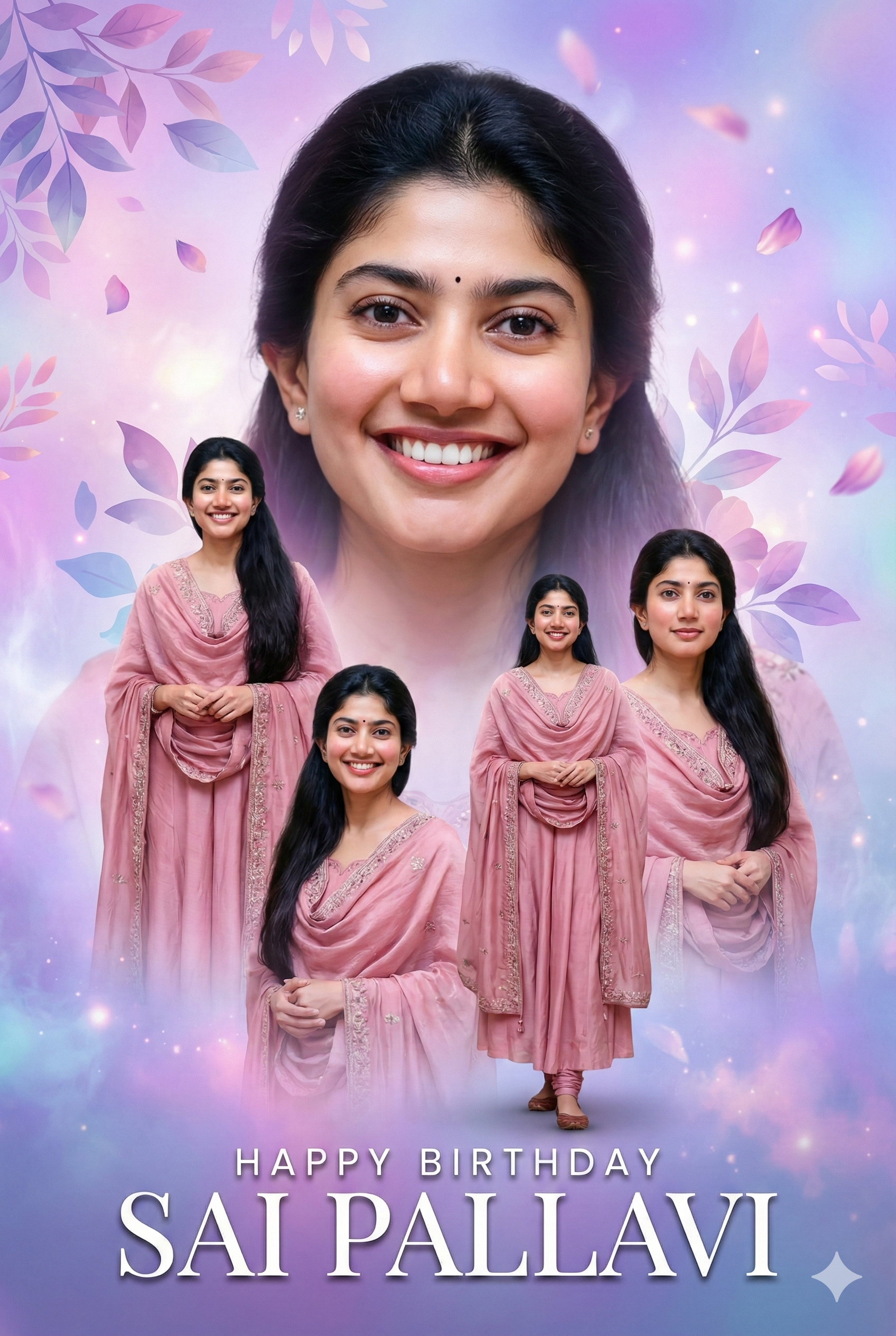 A dreamy cinematic birthday poster featuring the same young Indian woman shown multiple times in one frame, wearing a soft rose-pink traditional outfit with a matching dupatta, long black hair neatly styled, gentle smile and natural makeup. Create a layered composition with one large central portrait in the background and three to four smaller full-body and half-body poses in the foreground, all of the same person in different elegant poses. Background filled with pastel purple and pink gradient, soft glowing light, abstract floral leaves and petals in lavender, blue, and violet tones. Smooth skin retouching, studio-quality lighting, soft highlights, shallow depth of field, elegant feminine mood, high fashion Indian portrait style. Add subtle mist and glow around the subject for a magical feel.