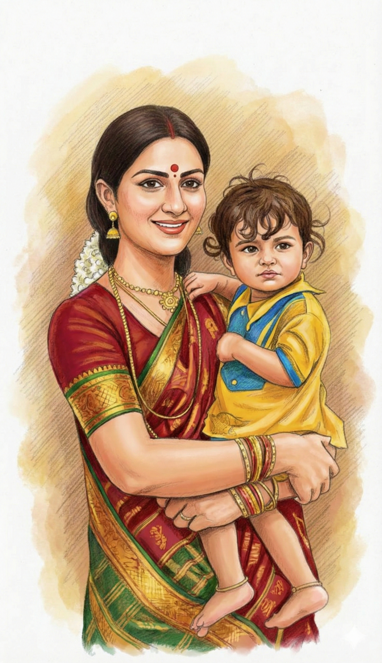 A beautiful traditional Indian mother holding her baby boy in her arms, warm and loving expression, South Indian Telugu woman wearing a rich red and green silk saree with golden zari border, jasmine flowers in her hair, red bindi, gold earrings, necklace and bangles. The baby is around 1 year old, curly hair, innocent face, wearing a yellow and blue traditional outfit. Soft hand-drawn illustration style, realistic pencil sketch with watercolor painting effect, smooth shading, fine line art, detailed facial features, warm pastel background, cultural Indian motherhood emotion, high detail, portrait composition, soft lighting, elegant and graceful.