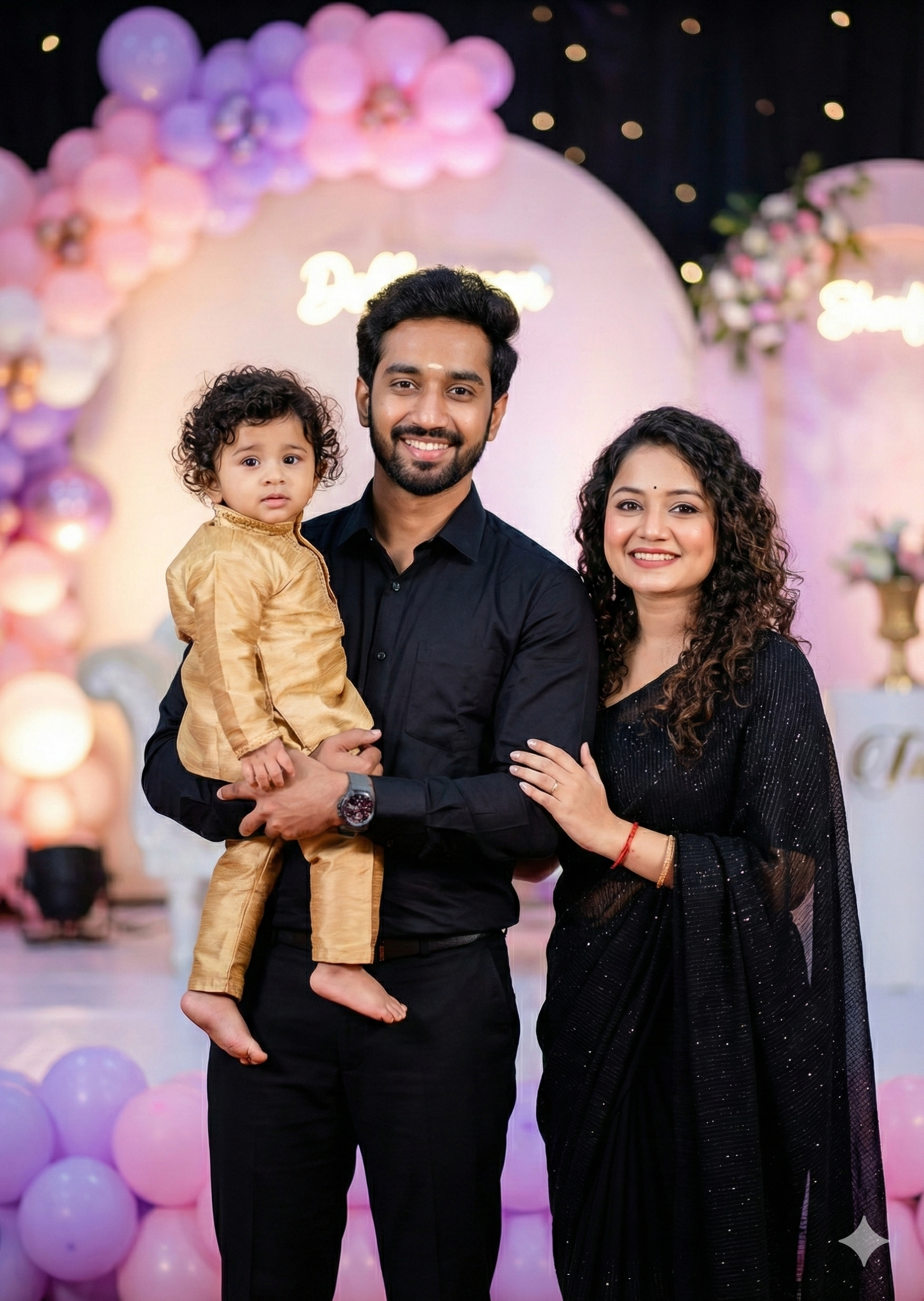 A happy Indian family posing at a luxury event stage, father holding a baby boy in his arms, mother standing beside him with her hand gently on his arm. Father wearing a black formal shirt, smiling confidently. Mother wearing an elegant black saree with subtle shimmer, curly hair, soft makeup, bright smile. Baby boy wearing a traditional golden silk kurta set, curly hair, innocent expression. Background decorated with pastel pink and purple balloons, soft glowing stage lights, elegant party décor, bokeh effect. Professional event photography, cinematic lighting, shallow depth of field, ultra-realistic, sharp focus on faces, DSLR quality, 85mm lens, high resolution, natural skin tones, festive celebration mood. Note: Don’t Change The Upload Photo Faces