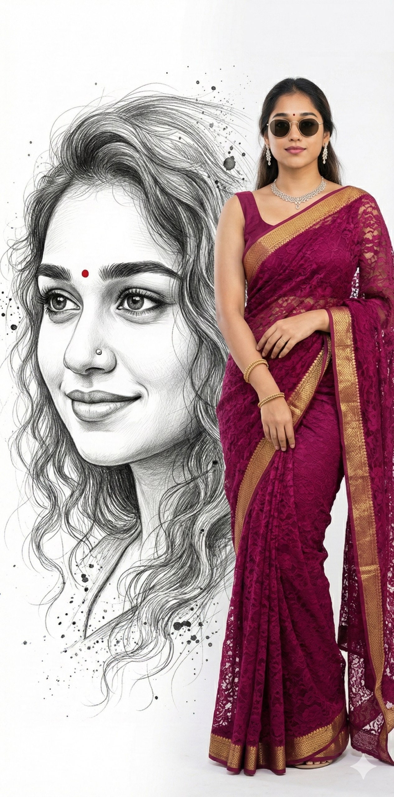 A stunning dual-composition portrait of an Indian woman. On the left side, a large black-and-white hyper-realistic pencil sketch of the same woman’s face, smiling softly, with expressive eyes, thick eyebrows, small red bindi, and a delicate nose pin. Her long curly hair flows naturally with fine graphite texture, ink splashes, and artistic dust particles fading into a white background. On the right side, a full-body ultra-realistic color photo of the same woman standing confidently, wearing a deep magenta lace saree with a golden border, sleeveless blouse, elegant diamond necklace and earrings, bangles, and round sunglasses. Natural skin tones, soft studio lighting, clean white background, perfect facial resemblance between sketch and photo, cinematic fashion portrait, high detail, 8K quality, professional photoshoot look.Note: Don’t Change The Upload Photo Faces