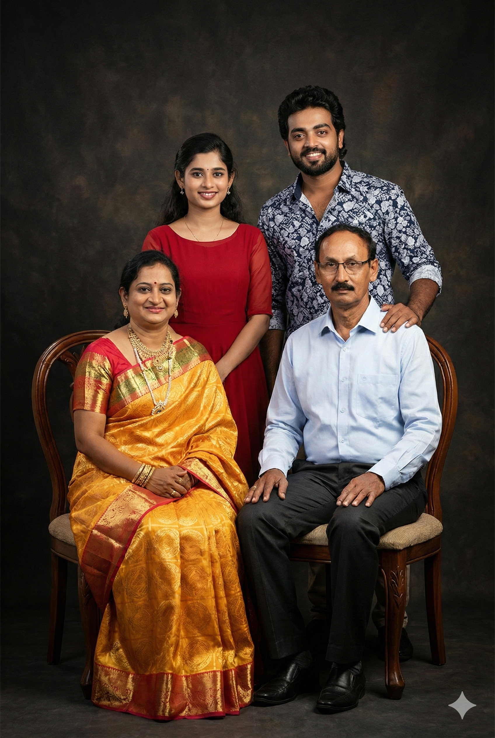 “Ultra-realistic studio family portrait of four people, Indian family, parents seated on chairs in the front and their adult son and daughter standing behind them, son gently resting hand on father’s shoulder, daughter standing gracefully beside him, warm and happy expressions, traditional Indian mother wearing elegant golden yellow silk saree with red blouse, father in light pastel formal shirt and dark trousers, son in modern patterned casual shirt, daughter in simple elegant red dress, professional studio lighting, soft shadows, dark textured studio background, sharp focus, natural skin tones, cinematic look, DSLR photography, 85mm lens, f/2.8, high resolution, realistic details, symmetrical composition, family bonding, classic portrait style” Note : Don’t Change The Upload photo faces