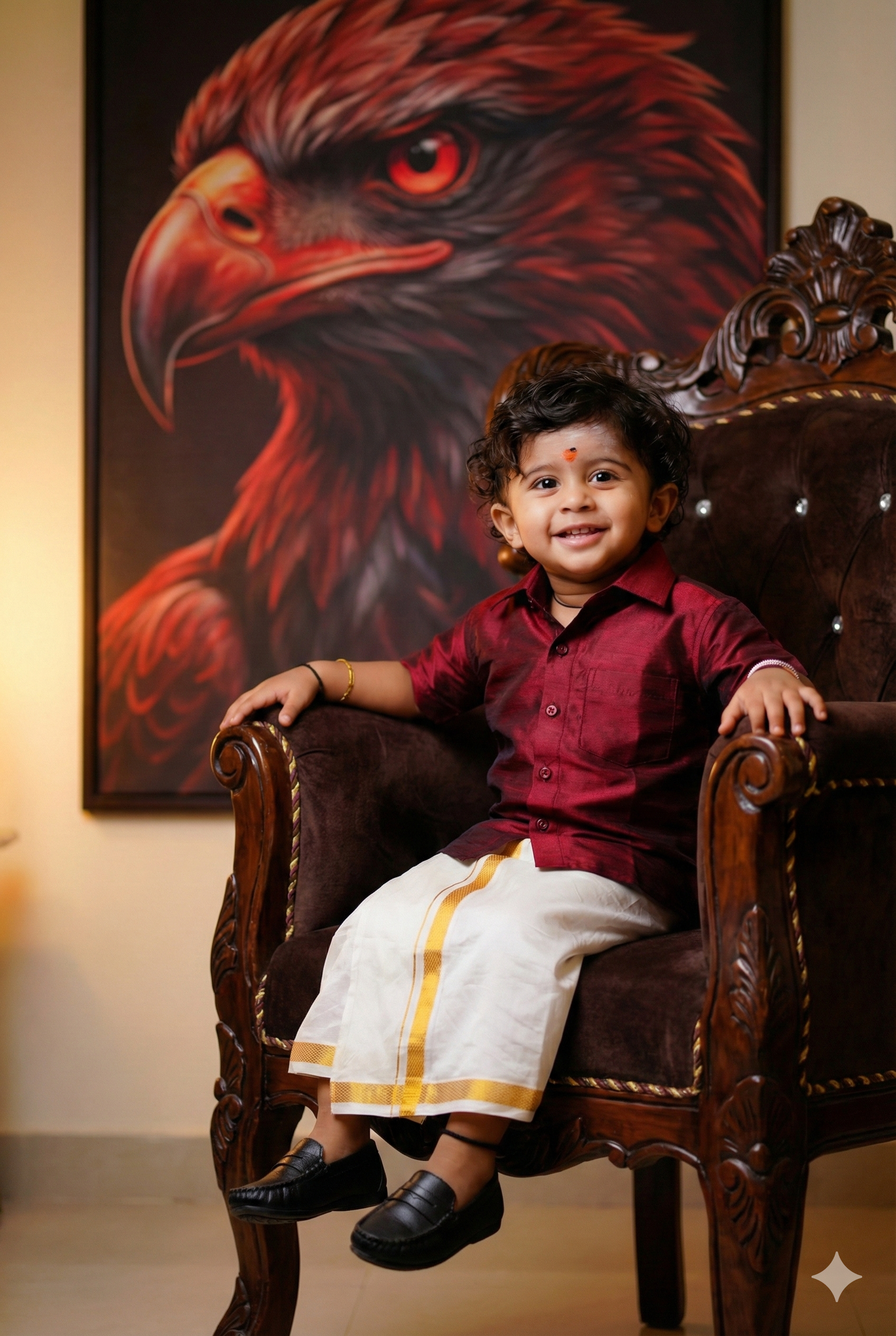 Create an 8K resolution photo of a 4-year-old boy wearing a maroon shirt, a white dhoti with a golden border, and black loafers, sitting comfortably on a king’s chair. He is smiling, and there is a large, artistic picture of a red and black eagle’s head with glowing eyes in the background, along with some soft, warm lighting effects. The camera angle should be from the left.