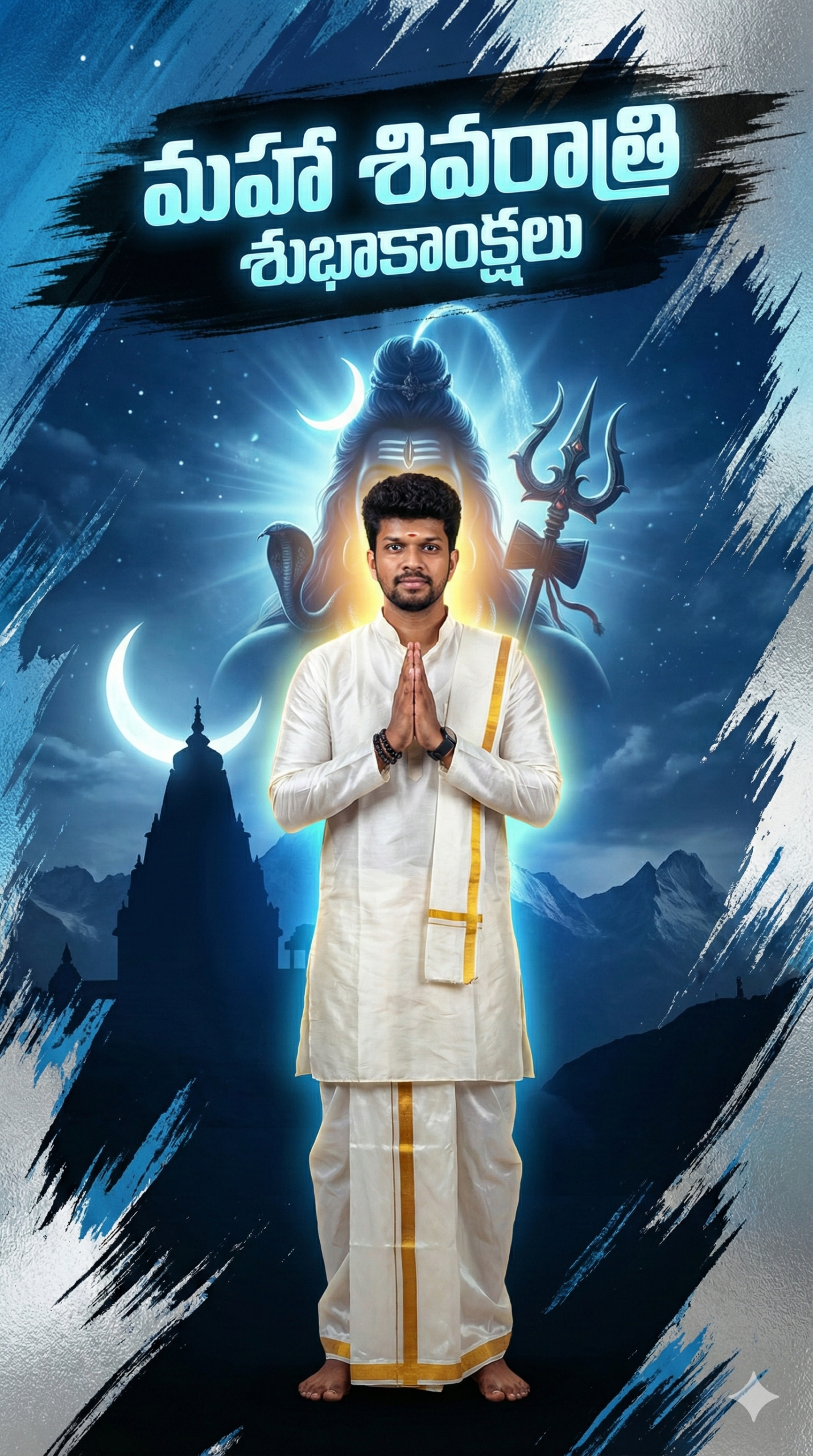 Create a Maha Shivaratri festival photo banner with a spiritual devotional background. Add a man (20 to 60 years old Indian person wearing traditional dress (white pancha / dhoti and traditional shirt or kurta). Place the person in center with divine lighting glow. Background Lord Shiva divine aura, moon light night sky, Himalaya mountains and temple silhouette. Add blue, black and silver night theme colors. Add artistic paint brush stroke effect across banner. Add Telugu text “మహా శివరాత్రి శుభాకాంక్షలు” in big bold stylish Telugu font on brush stroke. Ultra realistic, high detail, cinematic lighting, 4K festival poster design. 9:16 ratio