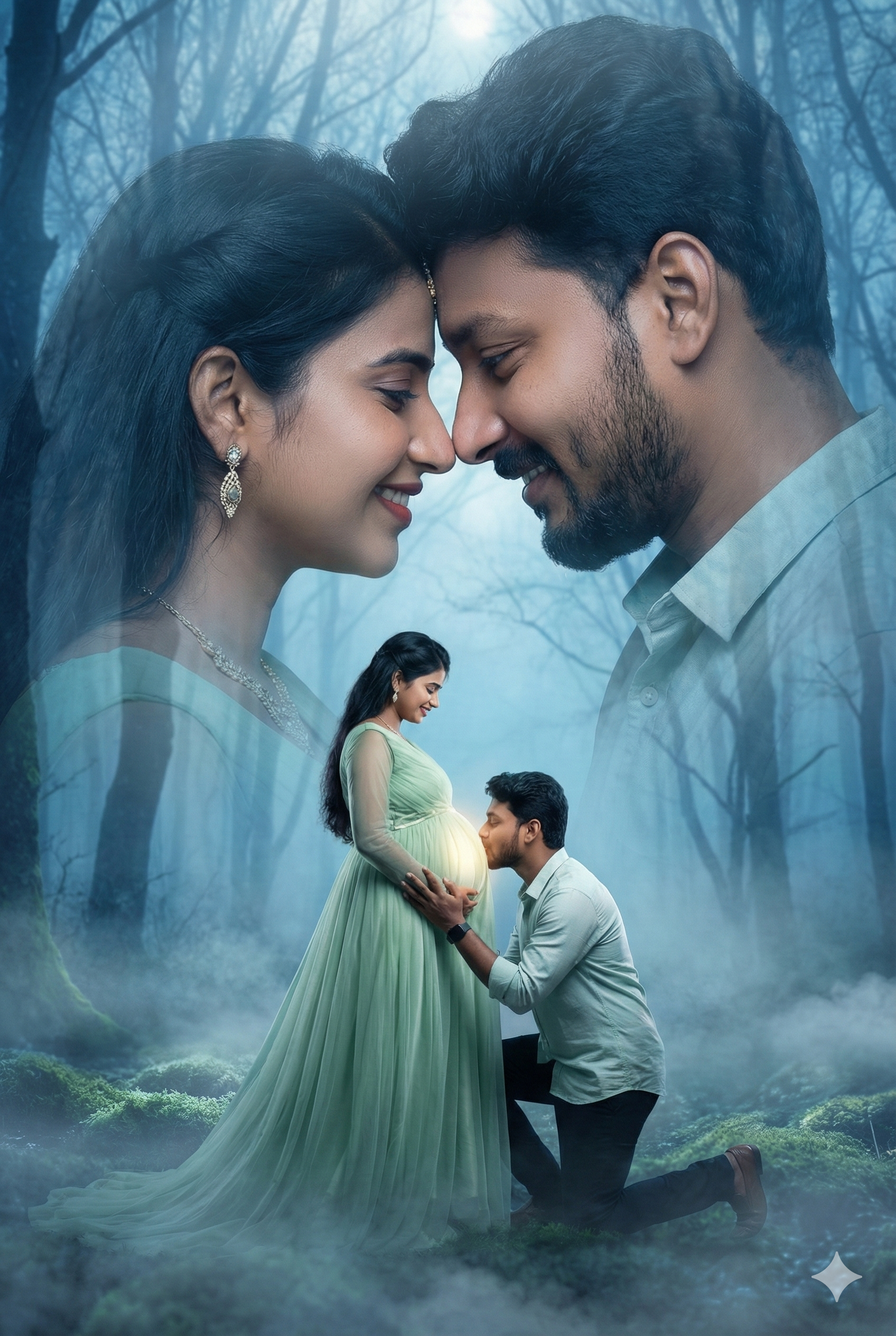In the foreground, a full-body maternity scene: the pregnant woman wearing a flowing light green gown, glowing and elegant, standing gently. The husband kneels beside her, lovingly hugging and kissing her baby bump, expressing joy and affection. Soft moonlight, cool blue tones, foggy ground, fantasy mood, cinematic lighting, smooth skin retouching, shallow depth of field, ultra-realistic, high detail, professional photo manipulation, romantic storytelling, fine art portrait, 8K quality. Note :Don’t Change The Upload photo faces