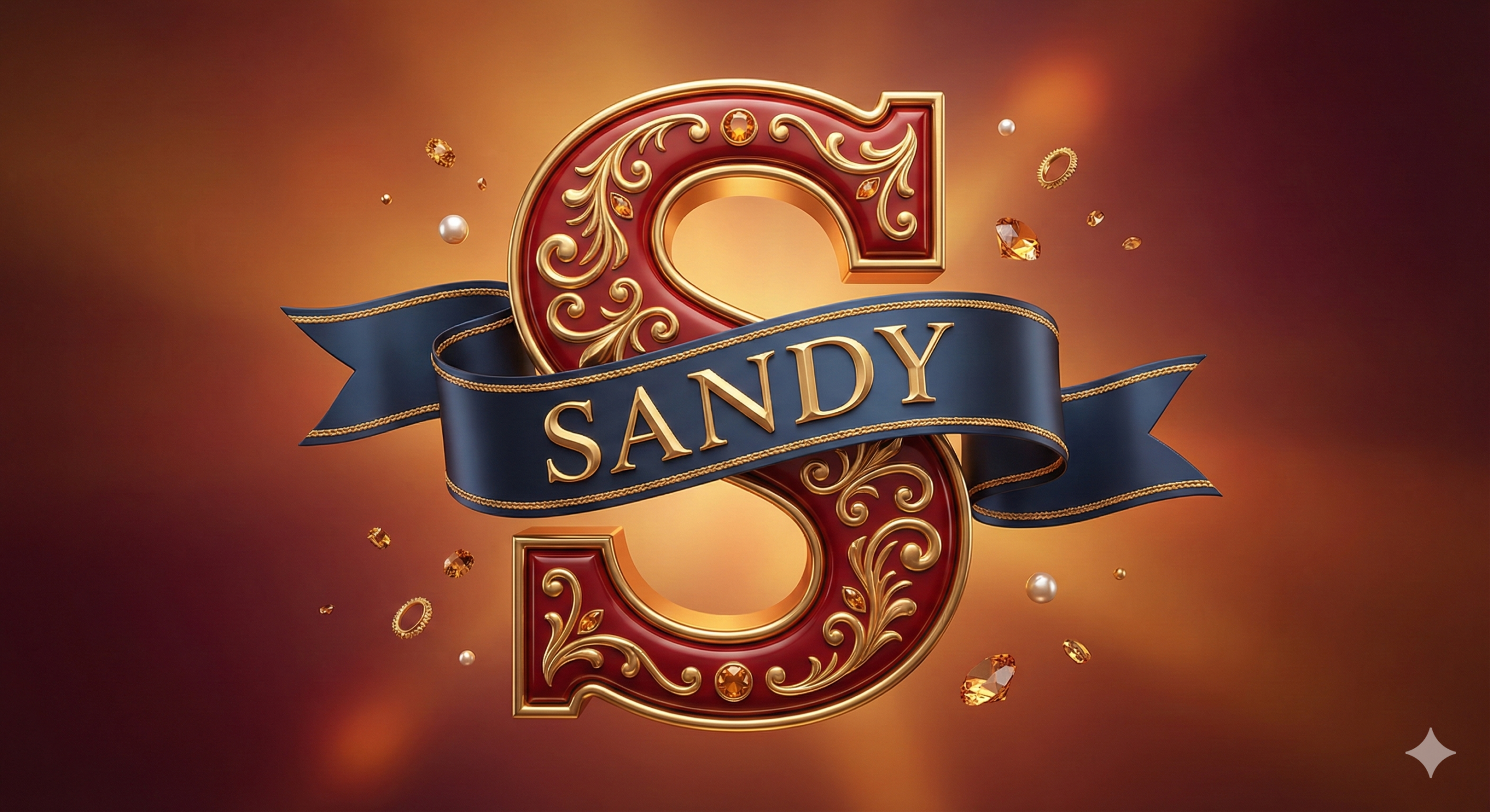 “Create a premium 3D typographic artwork featuring a large, bold letter D in deep red with gold metallic borders. Add embedded-like ornaments on the letter for a luxurious look. Wrap a flowing dark-blue ribbon across the center of the letter with the name DEVIKA written in elegant gold serif text. Use realistic lighting, soft reflections, and a warm gradient background. Add small golden gem elements around the composition for extra richness. Hyper-realistic, glossy finish,