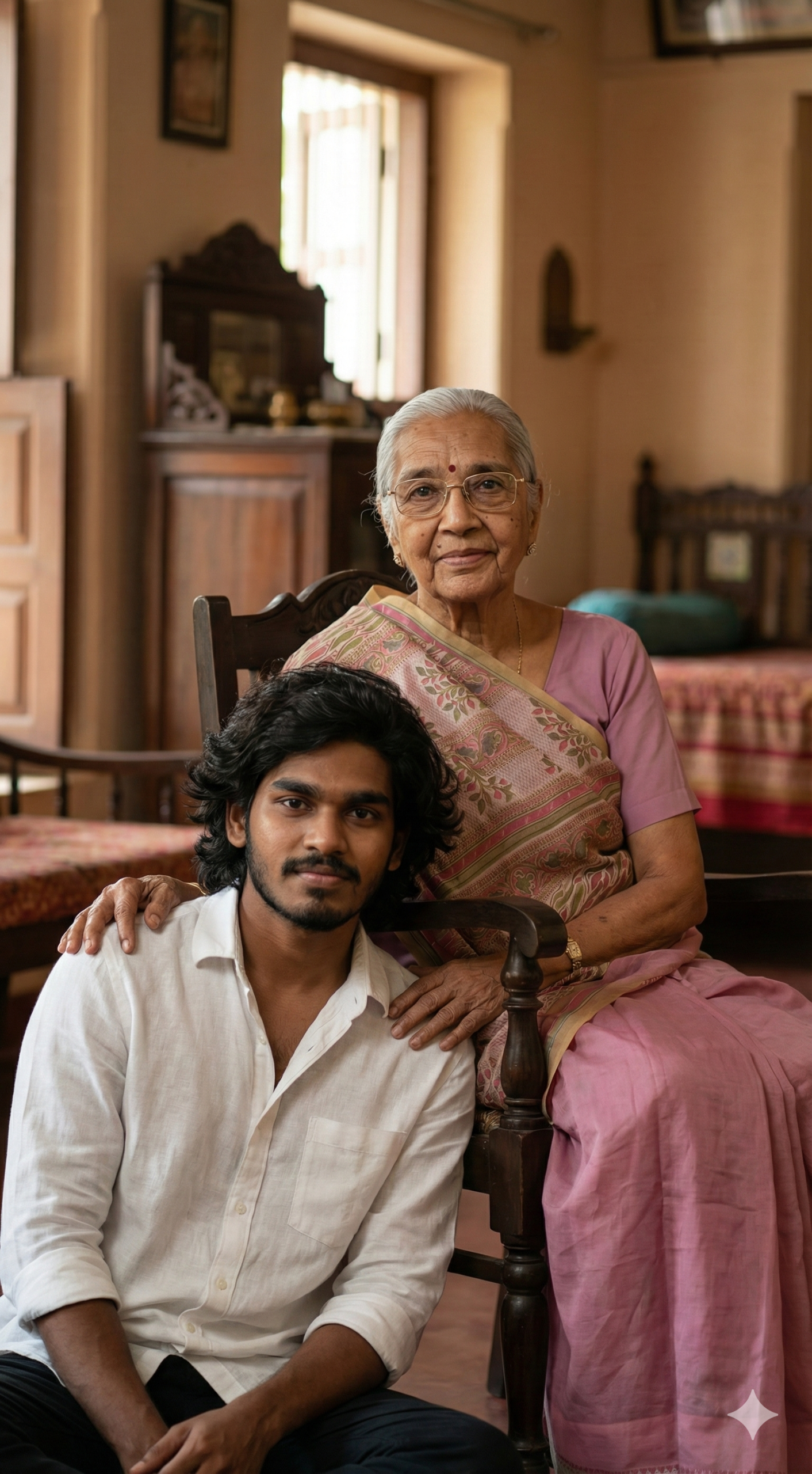 A warm and emotional portrait of a grandmother and her grandchild. The grandmother is sitting comfortably on a traditional wooden chair, wearing a simple saree, with a gentle smile on her face. The grandchild is sitting on the floor close to her, near her eyes level, leaning slightly and placing one hand on the grandmotherโs shoulder. The grandmotherโs hand is lovingly resting on the grandchildโs shoulder. Natural expressions, deep emotional bonding, traditional Indian home background, soft natural lighting, cinematic portrait style, shallow depth of field, high realism, ultra-detailed skin texture, peaceful and loving atmosphere, 4K quality, photorealistic. Bothe are seeing cemera