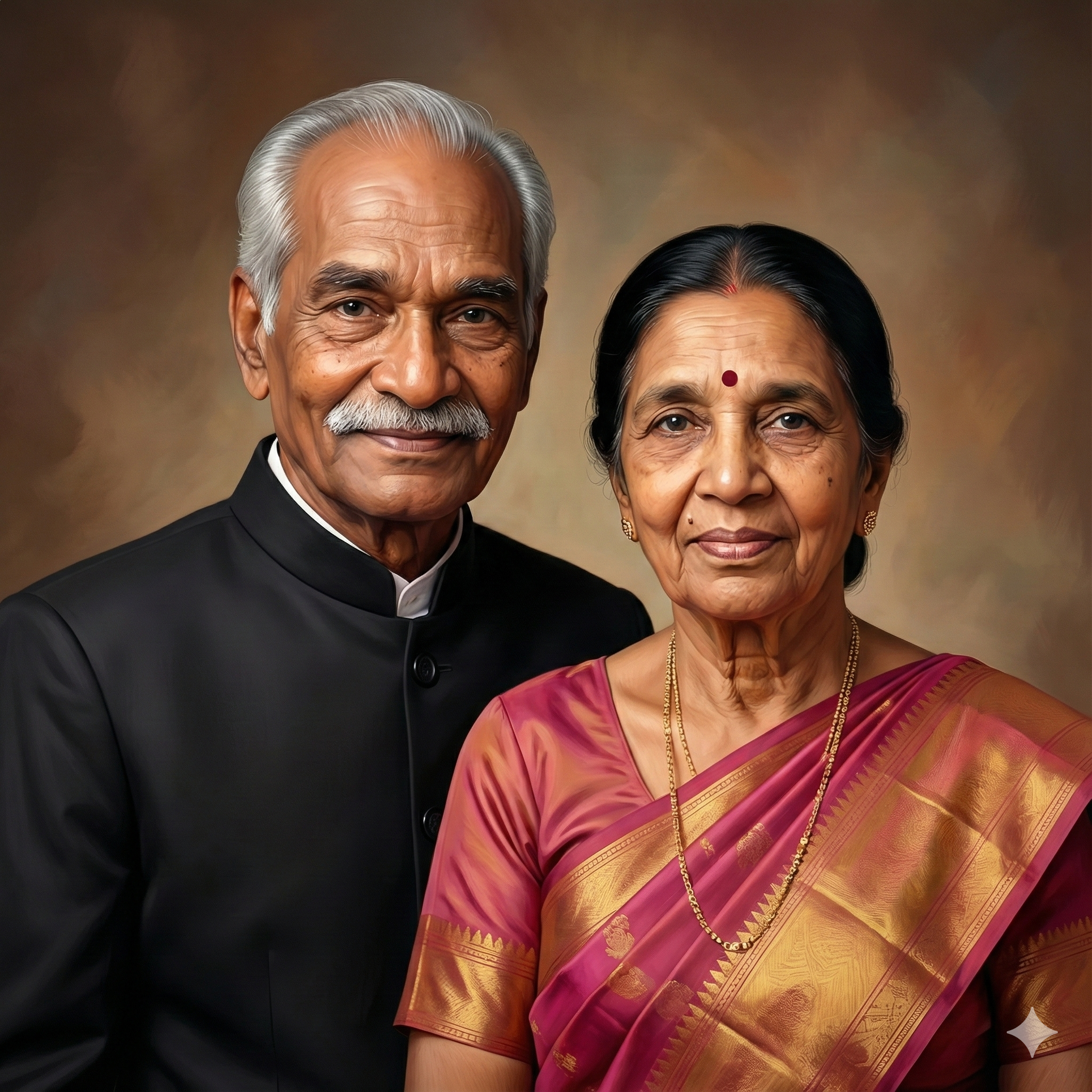 A realistic, studio-style portrait of an elderly Indian couple standing side by side, facing the camera with warm, gentle smiles. The man has neatly combed silver hair, a trimmed grey moustache, and is wearing a classic black formal jacket, looking dignified and confident. The woman is wearing a traditional Indian silk saree in rich pink and gold tones, with a matching blouse, subtle gold jewelry, small red bindi on her forehead, and neatly tied black hair. Both have natural skin textures with visible age details, conveying grace and wisdom. Soft cinematic lighting, painterly background with warm brown and beige tones, shallow depth of field, ultra-realistic facial details, professional studio portrait photography, elegant and timeless composition, high resolution, 8K quality, sharp focus, realistic colors.Note :Don’t Change The Upload Photo Faces