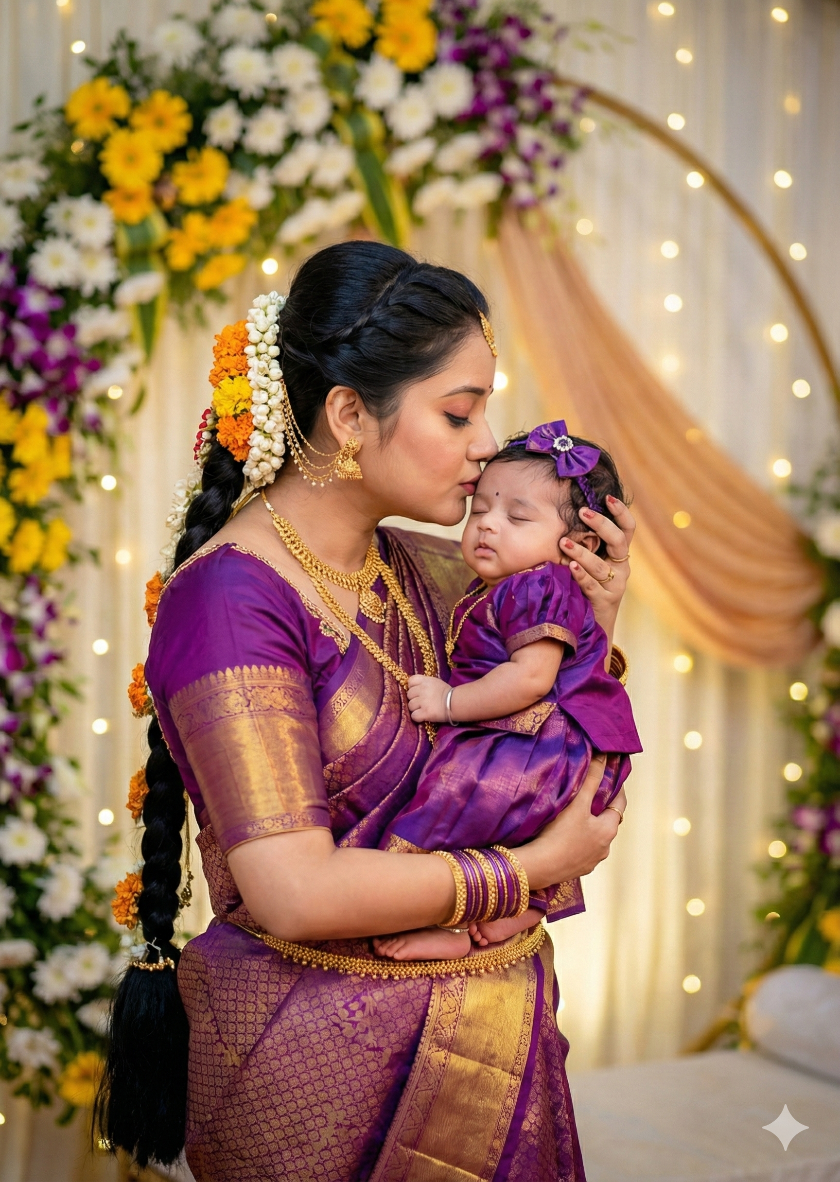 A beautiful Indian mother holding her newborn baby lovingly in her arms, mother wearing a rich purple and gold silk saree with traditional South Indian jewelry, long black braided hair adorned with flowers, soft makeup, emotional tender expression as she kisses the baby’s forehead. The baby is dressed in a matching purple silk traditional outfit with a decorative head bow, peacefully sleeping. Background features an elegant floral decoration with yellow, white, and purple flowers, warm fairy lights, wedding or naming ceremony stage setup. Soft cinematic lighting, shallow depth of field, ultra-realistic skin tones, vibrant colors, professional portrait photography, DSLR quality, 85mm lens, high resolution, 4K, detailed textures, cultural Indian celebration atmosphere.NOTE: Don’t Change The Upload Photo Faces
