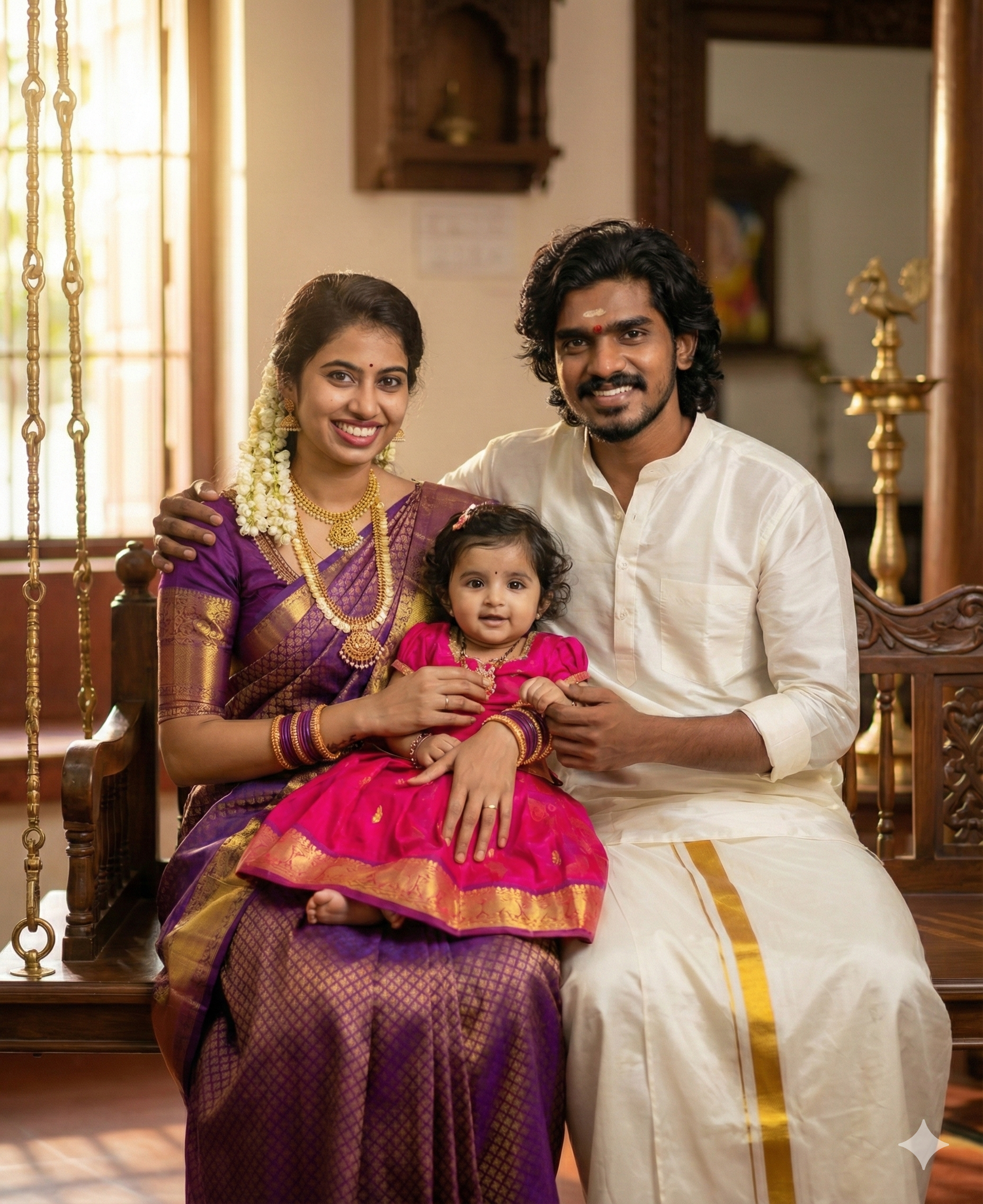 A beautiful South Indian family portrait indoors, young Indian couple sitting closely on a traditional wooden swing. The mother is wearing a rich purple and gold silk saree with traditional gold jewelry, jasmine flowers in her hair, soft smile on her face, holding a baby girl dressed in a bright pink traditional outfit. The father is wearing a white traditional kurta and veshti (dhoti) with gold border, gently placing his arm around his wife, looking lovingly at the baby. Warm natural light entering from a window, soft cinematic lighting, shallow depth of field, elegant traditional home interior background, realistic skin tones, emotional bonding, festive cultural mood, ultra-realistic, high resolution, DSLR photography style, 85mm lens, soft bokeh, professional family photoshoot. Note :Don’t Change The Upload photo faces